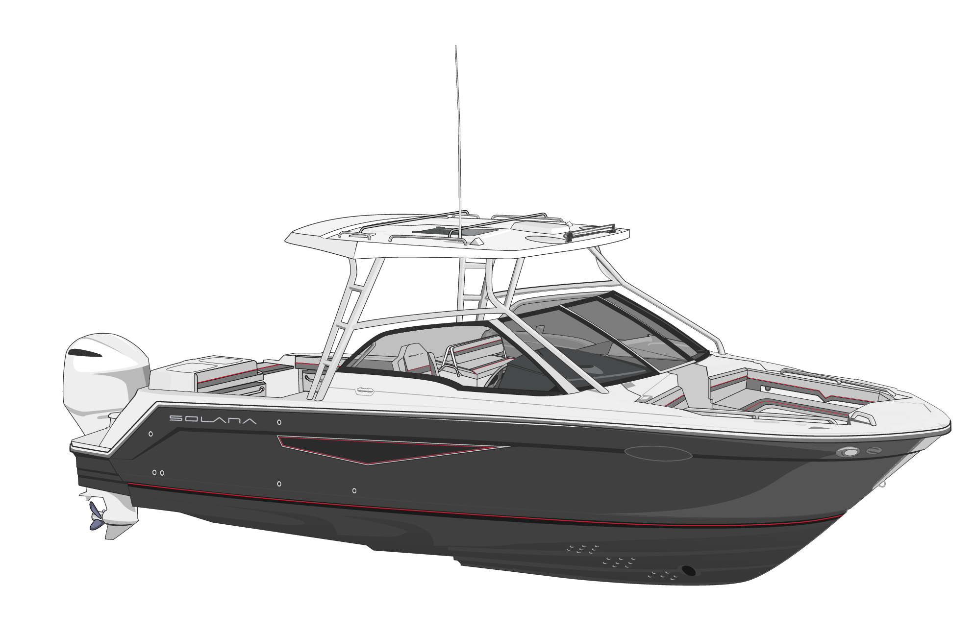 Solara’s S-250 Dual Console is just as comfortable blasting around the lake with the kids in tow, as it is gliding along the shoreline for a sunset cruise. Designed and built to be a master of multiple functions, the S-250 DC provides exceptional versatility. Whether you’re fishing, enjoying watersports, sightseeing, or entertaining guests, the S-250 DC opens up a new world of exciting possibilities. Powered by a Yamaha 300, she is fast, efficient and fun.